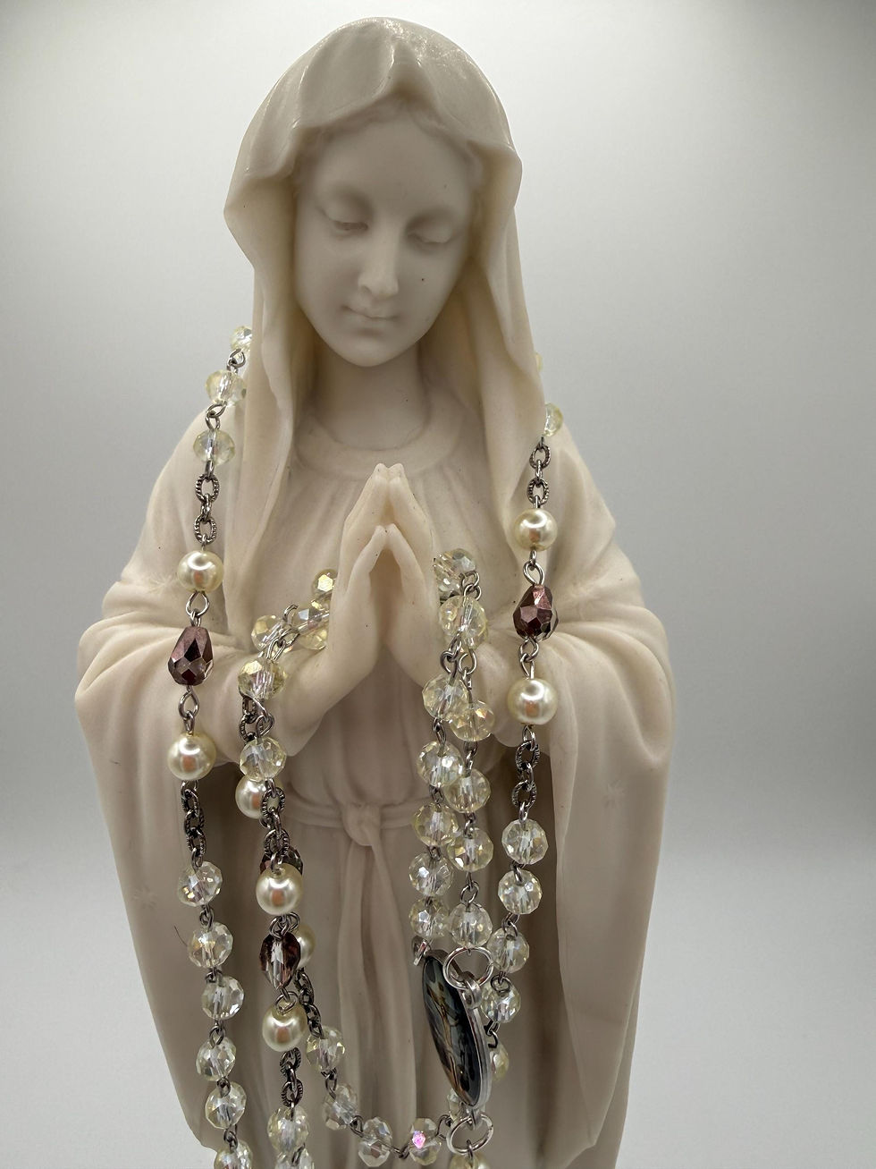 Catholic Rosary - Clear Crystal & Faux Pearl Beads with St. Benedict Crucifix